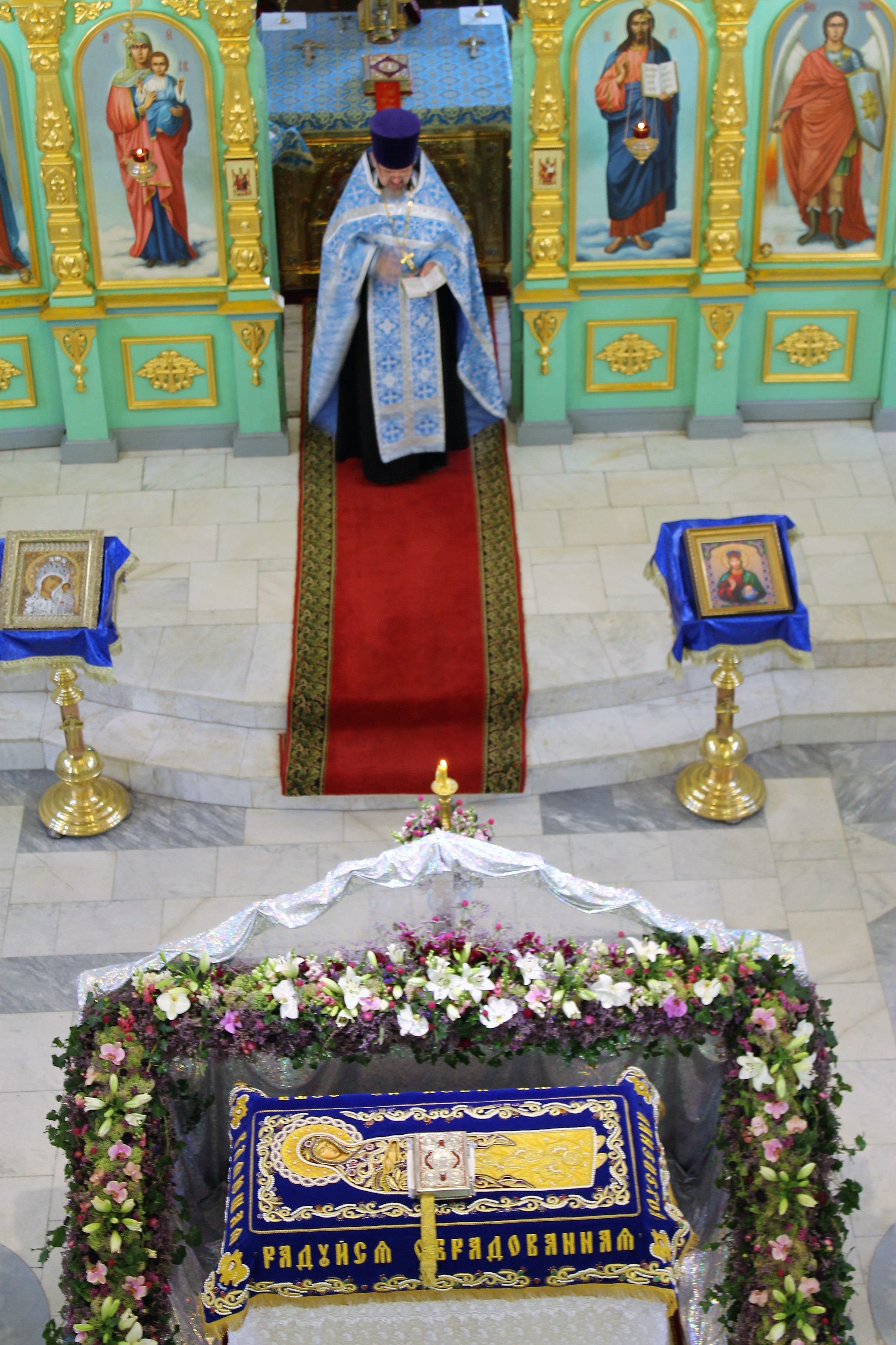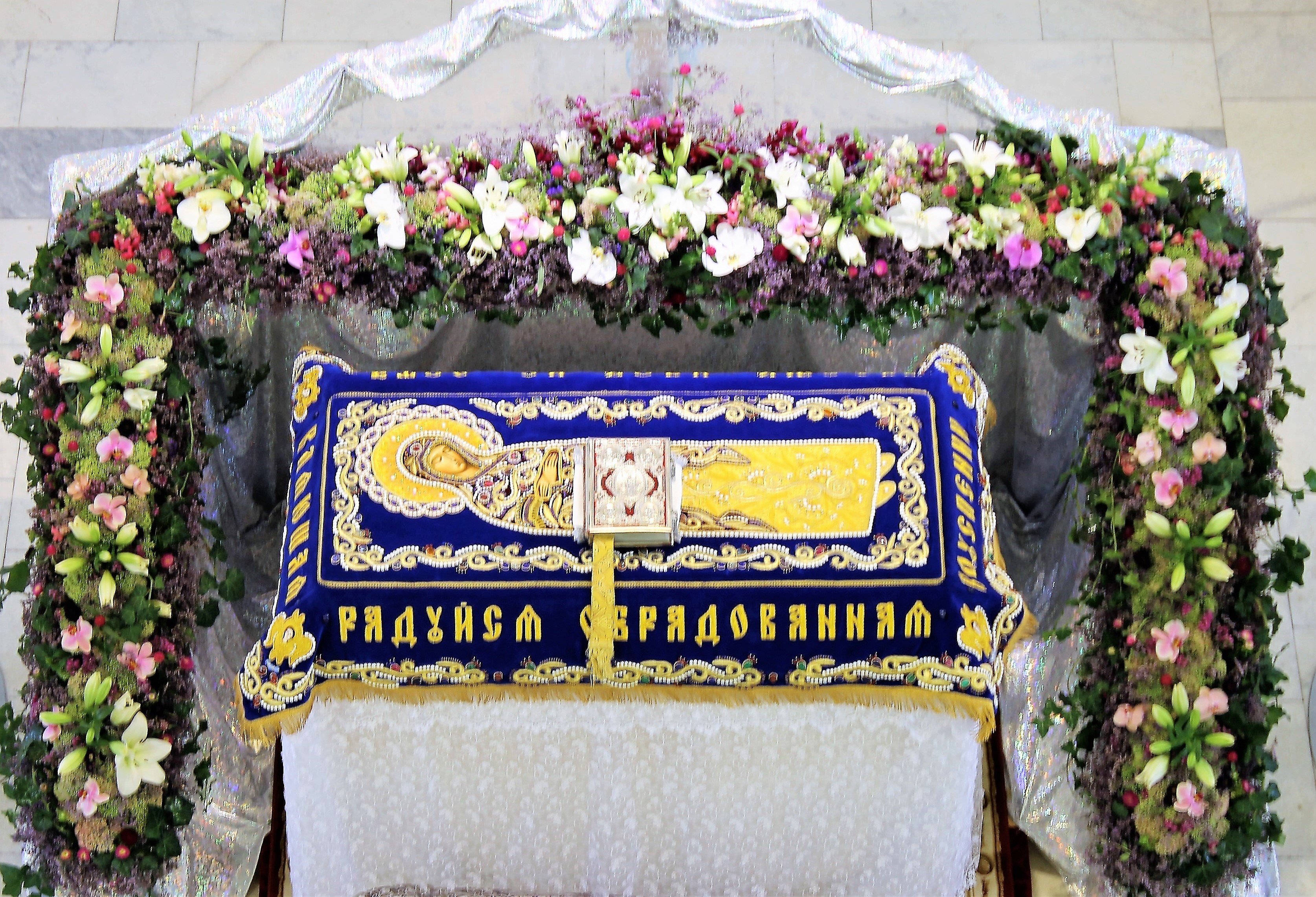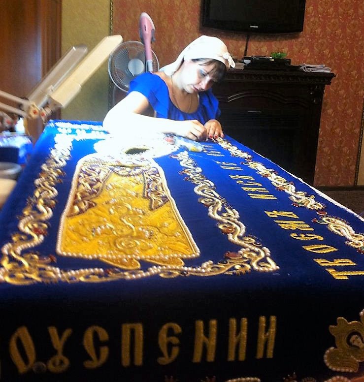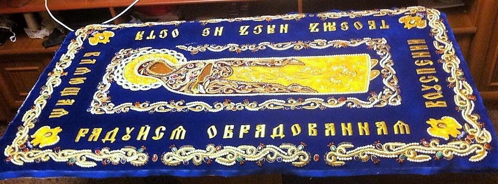 К празднику Успения Божией Матери прихожанка нашего храма Марина Кириченко по благословению отца Павла Великородного вышила новую плащаницу Богородицы.
