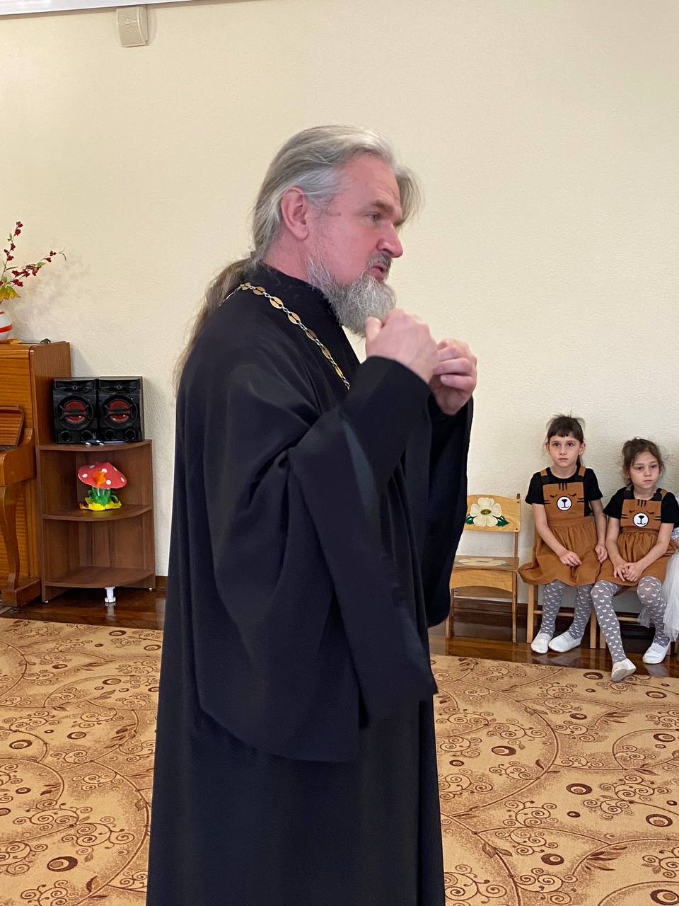 Мероприятие проходило в теплой, почти домашней обстановке. Отец Павел поиграл с ребятами, наставляя их молиться Божией Матери, и поблагодарил руководителей, педагогов и родителей за духовное воспитание детей.